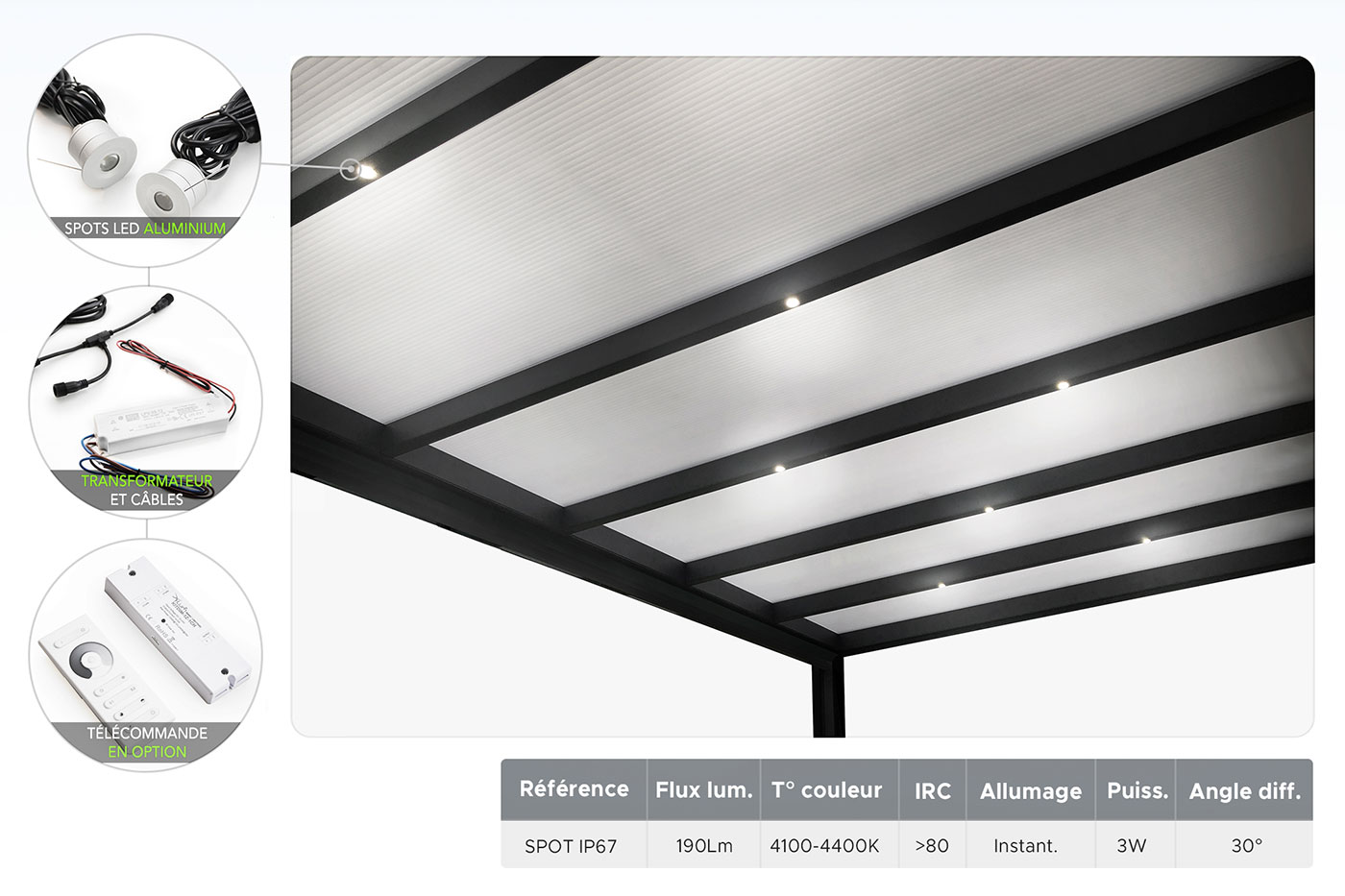 En effet, il ne faut pas utiliser n’importe quel système de luminaire. L’éclairage spot LED en kit est le système le plus adapté à votre pergola. Conçu spécialement pour votre solution d’aménagement, l’éclairage pour pergola s’intègre parfaitement à la toiture.