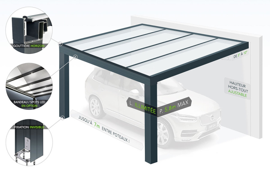 Robuste et design, bravez tous les intempéries avec le Carport Aluminium HORIZON. Sa conception sur-mesure lui permet de s'adapter à tous types d’architecture.