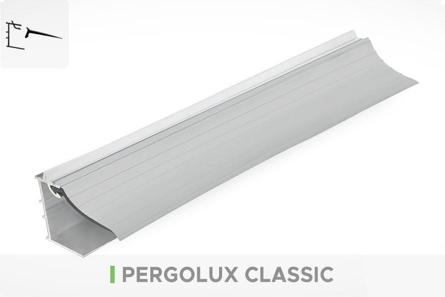 Le Pack Profil Mural EM16 PERGOLUX CLASSIC se compose de la partie faîtière à fixer contre votre mur, sur le haut de pente de votre structure porteuse.