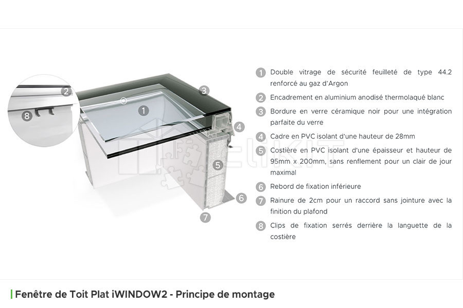 La Fenêtre de Toit Plat iWINDOW2 Fixe vous offre une excellente isolation grâce au châssis PVC compact et isolant, combiné au vitrage de sécurité super isolant. Pour plus de sécurité le verre intérieur est un verre feuilleté, le vitrage extérieur est trempé pour plus de resistance.
