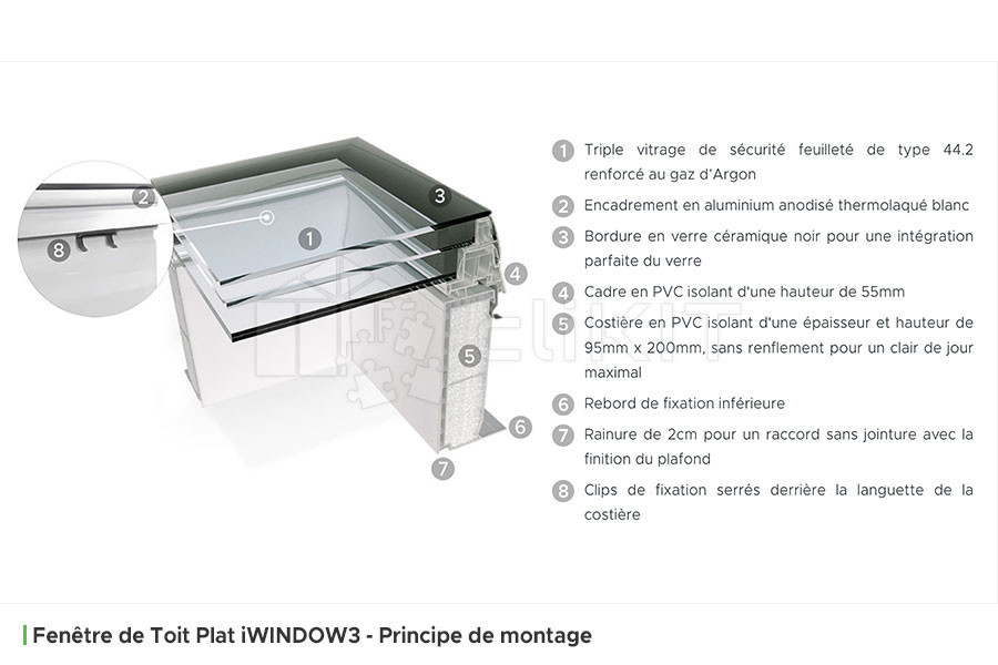 La Fenêtre de Toit Plat iWINDOW3 Fixe vous offre une excellente isolation grâce au châssis PVC compact et isolant, combiné au vitrage de sécurité super isolant. Pour plus de sécurité le verre intérieur est un verre feuilleté, le vitrage extérieur est trempé pour plus de resistance.
