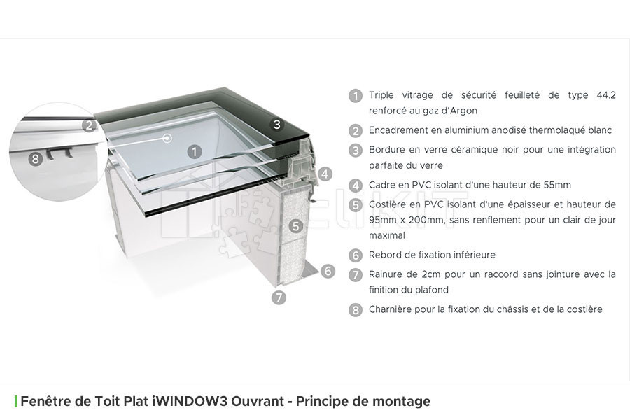 La Fenêtre de Toit Plat iWINDOW3 Ouvrant vous offre une excellente isolation grâce au châssis PVC compact et isolant, combiné au vitrage de sécurité super isolant. Pour plus de sécurité le verre intérieur est un verre feuilleté, le vitrage extérieur est trempé pour plus de resistance.