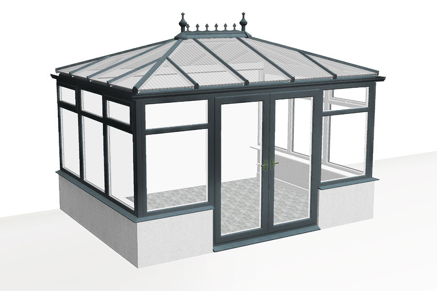 La Véranda NOTTINGHAM V1 Version sur Muret est une véranda munie d’une toiture à 4 pans de type pointe de diamant, entièrement sur-mesure !