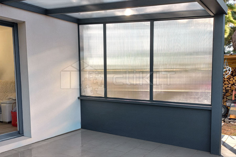Notre équipe technique reste disponible et à votre écoute durant toute la phase du montage de votre paroi latérale. Vous remarquerez assez vite la simplicité de pose du système. Il est possible de réaliser le montage en quelques heures seulement. Votre Paroi Latérale Mixte CliKIT arrivera sous forme de kit contenant la structure aluminium, les profils de fermeture, les parois de polycarbonate ainsi que les accessoires.