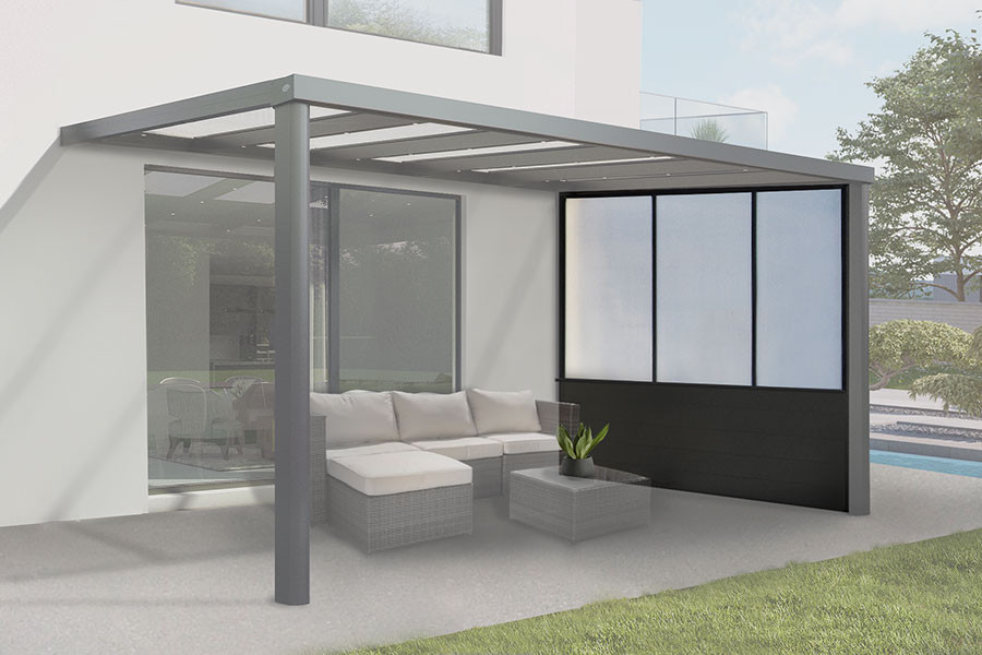 Ce système de paroi pour pergola est composé d'un soubassement plein de 800mm en aluminium thermolaqué et d'une partie haute en polycarbonate de 10mm.