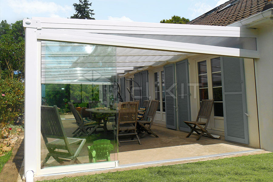 Le Verre Coulissant Latéral garantit la fermeture des côtés de votre pergola. Dépourvu de profils verticaux, chaque paroi en verre trempé coulisse sur un rail.
