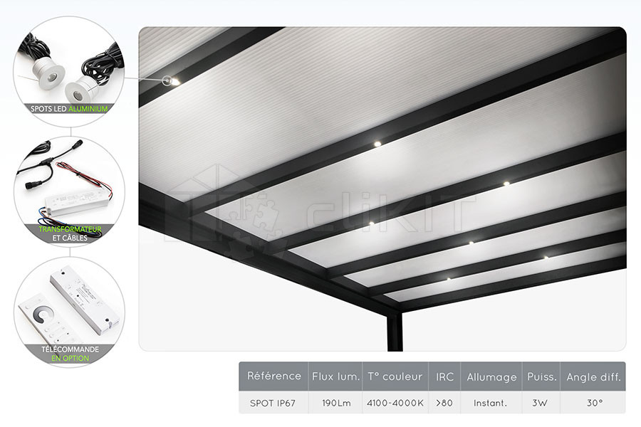 Indeed, you should not use just any lighting system. The LED spot lighting kit is the most suitable system for your pergola. Specially designed for your arrangement solution, the pergola lighting integrates perfectly into the roof.
