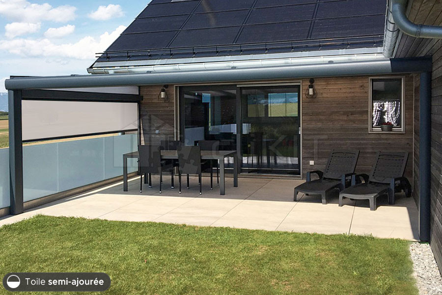 - Toile de protection solaire équipée de zips latéraux, disponible en version ajourée, semi-opaque, opaque (sur simple demande).