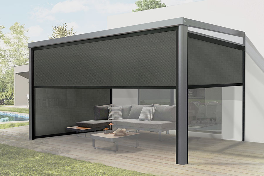 Abritez-vous du soleil sous votre pergola aluminium ou bioclimatique avec le Store Vertical Motorisé IMPERIAL ZIP 96 et sa toile de protection solaire MERMET.