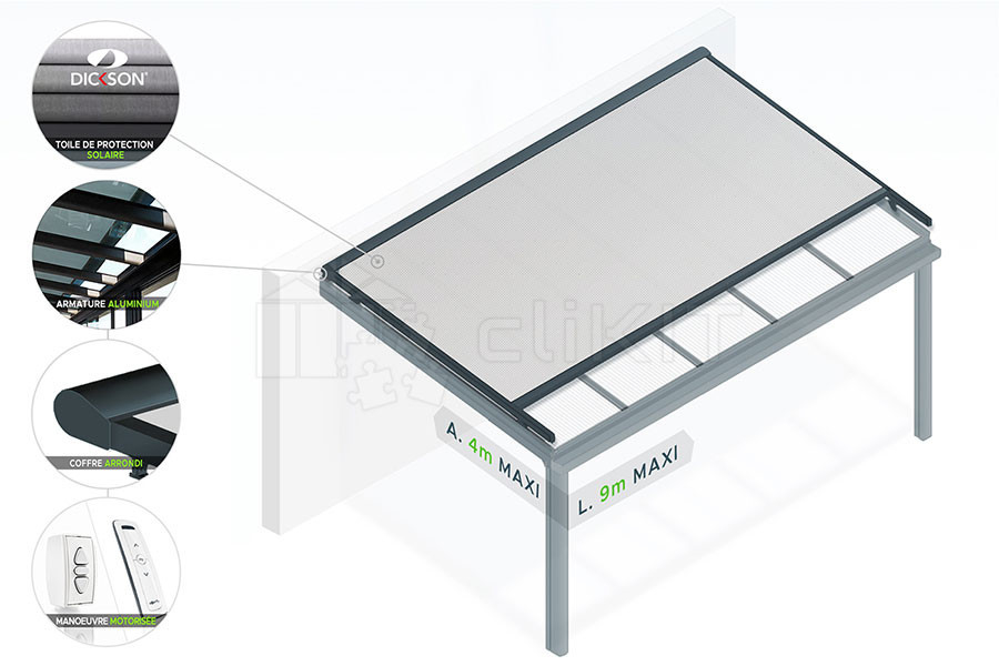 Le Store de Toiture WINSOL pour Pergola et Véranda permet de gérer la luminosité et réguler la température de votre espace grâce à sa toile de protection solaire DICKSON Orchestra.